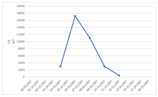 The following three days, an increase of CK up to 17230 U/l occurred, whereby the ratio of CK-MB as less than 1%. The highest measured Myoglobin level was 1728 ng/ml.