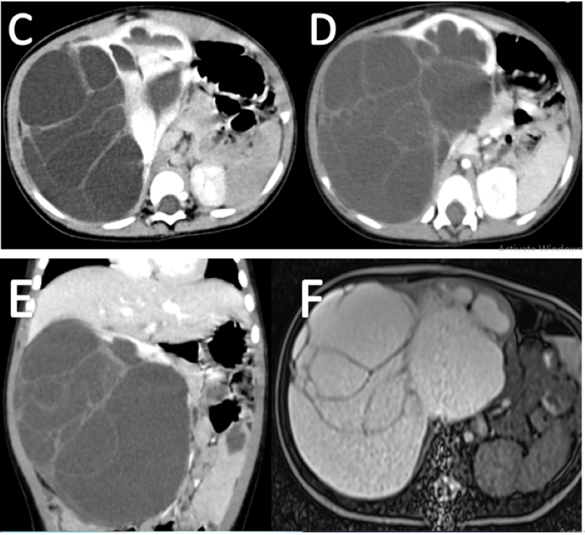 Figure F- Non-contrast MRI abdomen T2WI shows a well-defined multiloculated cystic lesion.