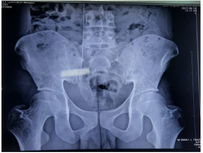 Figure 2: Pelvic X-ray showing the guidewire extending upto pelvic brim.