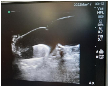 Figure 3: Intraoperative USG with J-Tip of guidewire in vessel lumen.