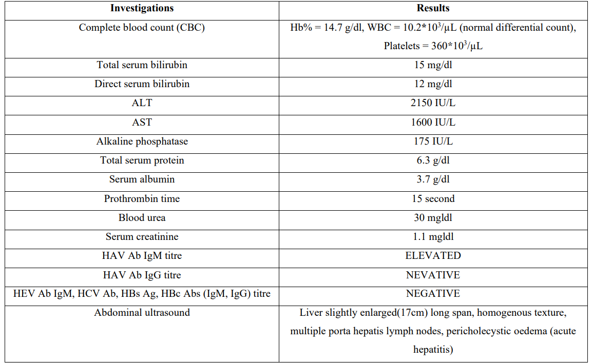 42-year-old male patient, immunocompetent with no previous history of liver disease, no history of alcohol consumption, no history of hepatotoxic drug or herbal ingestion, presented with three days history of sever jaundice, abdominal pain, fever, dark colour urine associated with nausea, anorexia and repeated vomiting.