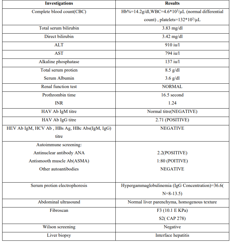 Hepatitis A virus (HAV) is an enteric-transmitting virus and the most common cause of acute viral hepatitis worldwide [1]. Generally, in childhood, the infection is asymptomatic or anicteric; however, it is often more severe in adults. Acute hepatitis A infection can be diagnosed by the detection of the immunoglobulin M antibody against HAV (AntiHAV IgM) in patients who have the clinical features of hepatitis, on the other side the autoimmune hepatitis (AIH) is a chronic liver disease characterized by circulating autoantibodies, elevated immunoglobulin G levels and characteristic histologic changes and when untreated can lead to acute liver failure or chronic liver disease resulting in cirrhosis. While the etiology of AIH is not entirely known, an association with human leukocyte antigen types DR3 and DR4 has been described [2]. Various viral triggers for AIH have been described, including the Epstein Barr virus, herpes simplex virus, HIV, and hepatitis A, B, C, and D viruses, specifically in genetically susceptible individuals [3]. Rare instances of AIH following acute hepatitis A virus (HAV) infection have been reported.