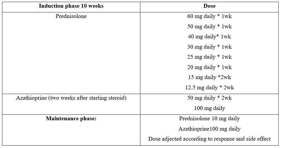 He was treated with oral prednisolone 60 mg/day for 2 weeks, after that Azathioprine was added at a dose of 50 mg/day, then the steroid dose tapered gradually and azathioprine dose increase to 100 mg/day, in a manner according to (British society of Gastroenterology BSG/European Association for study of liver disease EASL) shown in table(4).