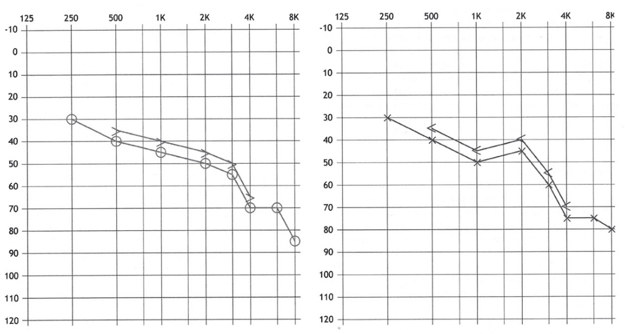 Figure 2. Audiogram of a 64-year-old female with bilateral high frequency hearing loss