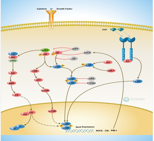Although intracellular signaling pathways are often described as discrete pathways, are probably more accurately thought as networks consisting of multiple interactions between pathways. Physiological and functional affections have been reported for interactions between JAK/STAT signaling and an amount of other cellular signaling pathways is known to be implicated in tumorigenesis, including downstream signaling of the EGFR, and androgen receptor (AR) signaling.