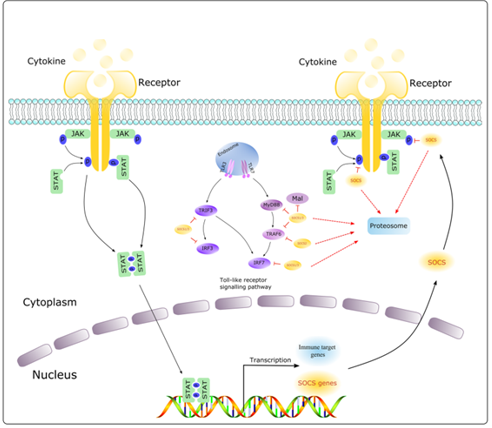 Four members of the JAK family, JAK1-3 and TYK2 have been recognized in humans, and are able to generate homodimers and heterodimers, and also seven members of the STAT family have been revealed, STAT1-4, STAT5A, STAT5B and STAT6, all of which are typically located in the cytoplasm when inactive [93].