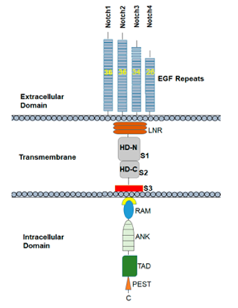 Notch family are trans-membrane proteins with dual functions, as act as membrane receptors and transcription factors. The Notch family in mammals, has four receptors, Notch1-4. Each receptor is composed in the endoplasmic reticulum as a precursor protein containing an intra-cellular, a trans-membrane, and an extracellular portion [32-34]. Five ligands for the Notch receptor have been identified so far, Delta 1, 3 and 4 (DLL1, 3 and 4) and Jagged1and 2 (JAG1 and 2), that are also trans-membrane proteins [34,129]. The pathway is activated when the ligand binds to the receptor of a neighboring cell. After activation, the receptors undergo a series of proteolytic cleavages by MMP TACE and the γ-secretase complex consisting of presenilin-1/2, nicastrin, Pen2, Aph1. TACE enzyme cleaves a portion of the receptor from its extracellular portion, that is internalized by the neighboring cell that has expressed the ligand [34]. (Figure 4 and 5).