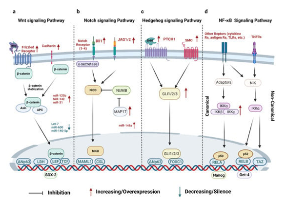 Data concerning the mutated Notch in SCCs showed that Notch function relies on aspects such as, Notch function can be affected by the p53 pathway and the intrinsic transcription-repressive protein RBP-Jκ [82]. The underlying regulatory mechanism is unclear, although some reports suggested that Notch signaling maintains the CD133 phenotype in SCCs stem cell [214]. Moreover, decreased Notch1 expression also dysregulates cell cycle-associated genes in SCCs such as LSC [185].