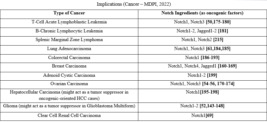 As mentioned, Notch pathway plays a crucial role in survival, cell proliferation, differentiation, and apoptosis, processes that affect the development and function of many organs. Notch pathway dysfunction prevents differentiation leading undifferentiated cells to malignant transformation. Scientific observations suggested that the Notch pathway alterations are associated with many cancers, such as breast, lung, ovarian cancer and leukemia. In addition, its receptors and ligands may be prognostic or diagnostic markers for cancer [40].