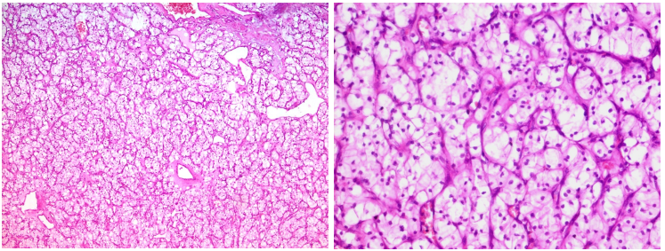 Figure 1.Histological images of a clear cell renal cell carcinoma. On the left, carcinomatous proliferation organized in nests with thin-walled vessel-rich stroma in the background [x100, under standard staining]. On the right, the cells are well limited, with clear optically empty cytoplasm and round nuclei without nucleoli (ISUP grade 1) [x400, under standard staining].