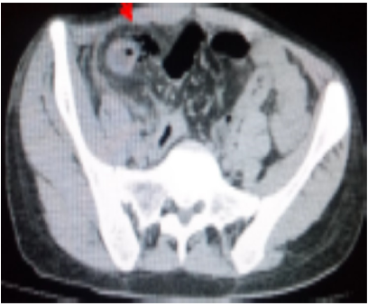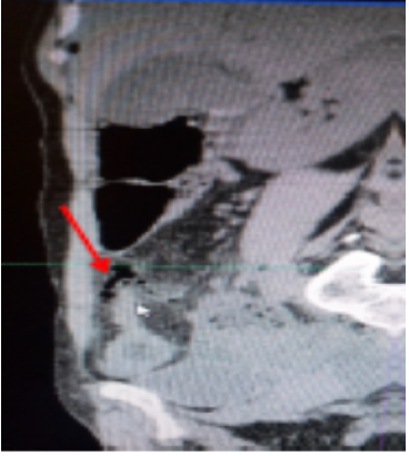 Figure 1.Computed tomography section showing extra-digestive air bubbles opposite the last ileal loop (red arrow)