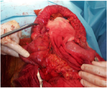 The patient underwent emergency surgery, and intraoperative exploration revealed a cardboard ileal loop with sclerolipomatosis, the site of a 07 mm perforation leaking digestive fluid (figure 3). An ileocaecal resection was performed, with closure of the distal colonic end and stoma of the proximal ileal end. Abundant peritoneal lavage with isotonic saline was performed. The patient underwent antibiotic therapy with ertapenem 1g/d and preventive anti-coagulation with lovenox 40ui/d. Post-operative follow-up was straightforward, with the patient discharged on postoperative day 8. Re-establishment of digestive continuity was carried out 03 months later in another hospital department, as the patient resided abroad.