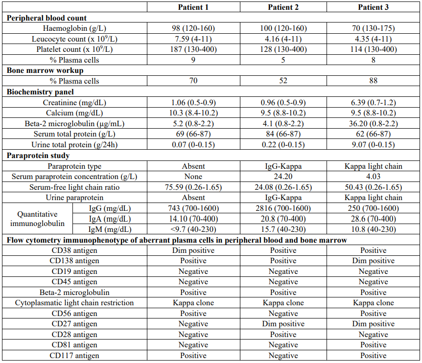 >Citation : Nuez-Zaragoza E, Bhambi-Blanco I, Baena N, Perea G, Martínez M, et al. (2024) A Review of Three Cases of Primary Plasma Cell Leukemia: Incidental Finding Discovered by Blood Smear Revision. J Case Rep Med Hist 4(4): doi https://doi.org/10.54289/JCRMH2400120