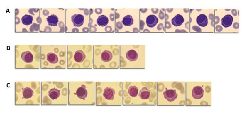 Figure 1: Aberrant plasma cells in peripheral blood smear. A: Patient 1 (9 %); B: Patient 2 (5 %); C: Patient 3 (8 %).