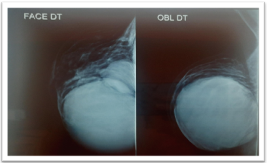 Mammography reveals two voluminous masses distorting the mammary contours and occupying almost all the right internal quadrants. The larger mass is located on the upper inner quadrant of the right breast, while the second is located in the lower inner quadrant of the right breast, they are high in tone, well-defined, with regular contours (figure 2).