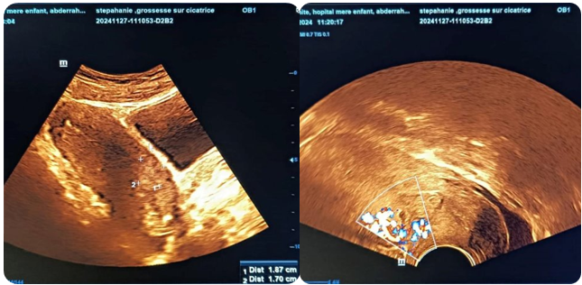 Caesarean section is the most common obstetric procedure in the world, with a steadily rising rate, averaging 21% of births worldwide, and sometimes exceeding 30% in some middle- and high-income countries [1]. This rise can be explained by a variety of factors, including increased medicalization of childbirth, maternal preferences and local clinical practices. However, this trend is accompanied by an increase in uterine scar-related complications, notably scar pregnancy, a rare form of ectopic pregnancy implanted at an old uterine incision [2]. Although uncommon, this condition represents a major risk of uterine rupture, severe haemorrhage or even hysterectomy, and seriously compromises subsequent fertility [3]. In this context, it is essential to understand the mechanisms, diagnosis and management of this condition.