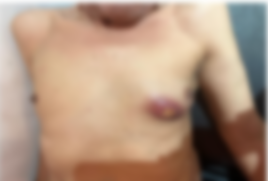 Breast tuberculosis is among the most unusual of tuberculosis extra-pulmonary (0.1%), and about 4.5% of breast tumors [5]. It commonly affects young women (95% of cases) [1]. It rarely affects men, and the literature reports…very few isolated clinical cases. Tuberculous breast involvement is most often secondary to a pulmonary tuberculosis (37%) or extra-pulmonary (7.6%) and the pathway of contamination is either lymphatic from a thoracic focus or abdominal, either direct from a costal focus, chondrocostal, or sterno- clavicular [6]. In our context, the pleural focus seems to be the focus primitive. In humans, the first case was described in 1927 and until 2017, that is 90 years later, only 26 cases were reported in the literature including 4 cases in Africa [7]. Due to this rarity, human breast tuberculosis is little known and therefore easily confused with other differential diagnoses should include breast carcinoma and gynecomastia or abscess to pyogen, non-tuberculous granulomatous mamopathy, the mamopathy atypical mycobacterial, plasmocellular mastitis [8]. This was the case in our patient who, for a hypothesis of a malignant breast tumor.