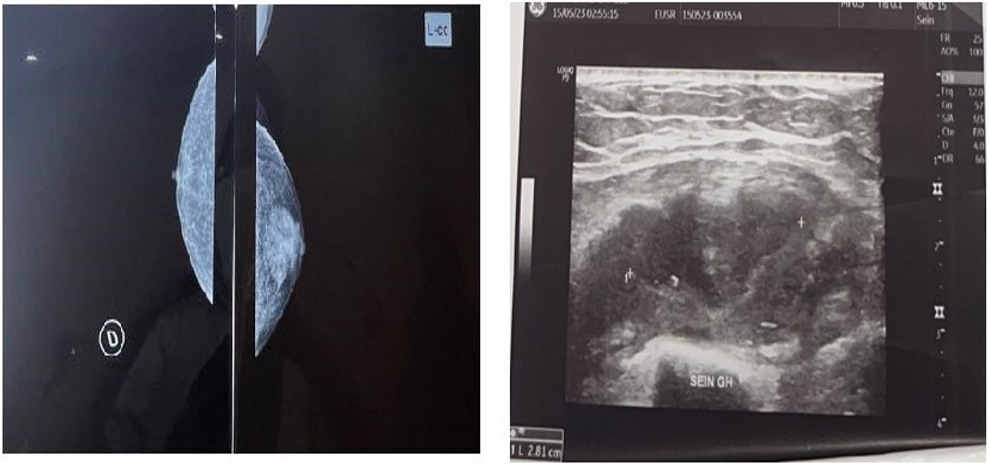 Although both breasts may be affected with equal frequency, bilateral forms occur in only 3% of cases [9]. Axillary adenopathies are found in 75% of cases, mobiles can evolve towards the fistulisation [10]. Mammography is not a decisive contribution because most of the images are malignant in appearance. Ultrasound usually reveals a hypoechoic mass in 60% of cases [11]. CT and MRI assess the extension towards the chest wall and explore the pulmonary parenchyma in search of an associated pulmonary form; can provide useful information, in particular about the extent of the disease. However, none of these results of image is not specific to breast tuberculosis. Tuberculosis coexistent pulmonary may be suggestive of mammary tuberculosis, but the active disease is often absent