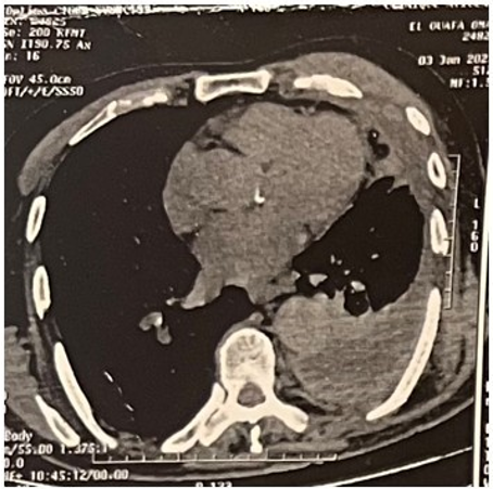 Figure 3: Axial CT scan showing a left breast mass with a maximum diameter of 76.7 mm.