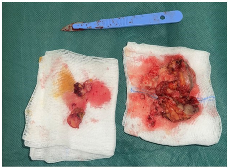 The patient had benefited from a surgical biopsy with an aspect of caseum at exploration (Figure 4). Result Anapath was in favor of an epithelial-giganto-cellular granulomatous lesion primarily suggestive of a tubercular origin.