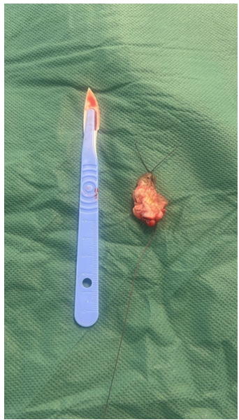 Figure 2: Surgical specimen after excision, showing the resected vulvar lesion beside a scalpel for scale.