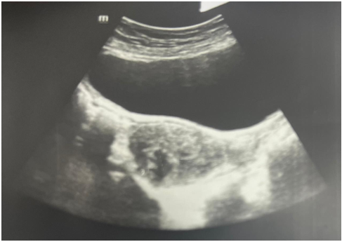 Figure 1: Ultrasound image showing an enlarged left ovary with heterogeneous echotexture, measuring 62x46 mm