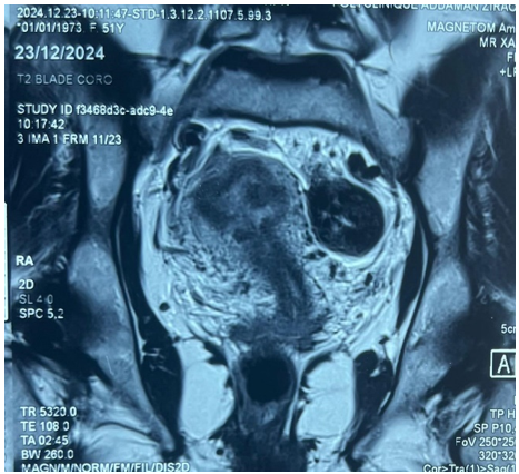Figure 2: Frontal MRI view showing a predominantly solid left ovarian mass measuring 67x54x53 mm.