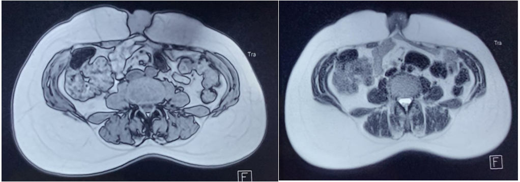 Thirty-eight-year-old patient, with two live children by caesarean section, consulting for Dysmenorrhoea and cyclic pelvic pain evolving for 6 months with, on clinical examination, an indurated mass measuring 4x3 cm opposite the external right side of the pfannestiel scar, pelvic ultrasound objectifying a deep, finely hypoechoic parietal nodular formation, measuring 32.7 x 12.7 mm, communicating with the pelvic cavity through a 4-mm diameter opening, suggesting an endometriotic nodule, followed on pelvic CT and MRI by a 35x20-mm nodular tissue mass of the rectus abdominis, suggesting parietal endometriosis (figure 1) associated with minimal subperitoneal endometriosis.