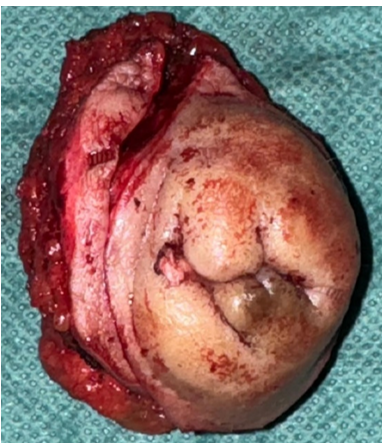 The surgical procedure involved resection of the mass (figure 5), with pathological examination revealing a polypoid congestive lesion with a congestive, lobulated surface, the site of haemorrhagic and fibrous remodelling, and comprising regularly lined endometrial glandular structures with no cytonuclear atypia, surrounded by a cytogenic stroma with no signs of malignancy, all in favour of parietal cutaneous endometriosis with no signs of malignancy.