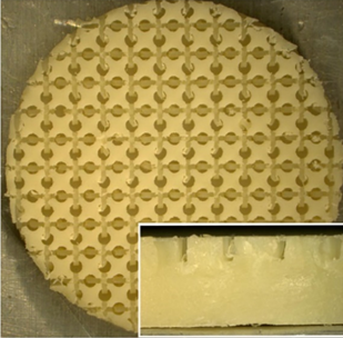 Contact angle analysis was conducted on the sPEEK specimens using distilled water to determine the hydrophilicity of the material type. The patterned specimens were tested but due to the surface structure resulted in complete wettability or the absorption of the water into the pores and channels of the pattern. All measurements were performed at ambient room temperature using 3 µL droplets of distilled water. Images were captured using a VHX digital microscope (Keyence Corp., Osaka, Japan) and water contact angles were analyzed using the Keyence software.