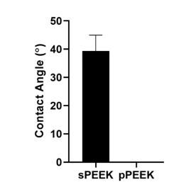 Figure 3:Contact angle analysis done on sPEEK and pPEEK. pPEEK specimen showed complete wettability within the pattern matrix.
