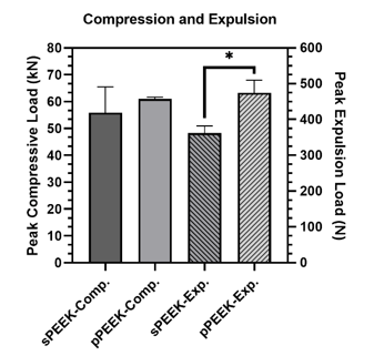 Figure 4:Peak loads for compression testing and expulsion testing. The * indicates significant difference of p < 0.05.