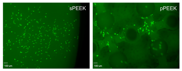 When observing the DNA content data and the live/imaging data, it appears that the solid PEEK specimens were more favorable for cell proliferation and did not readily switch from proliferation to the differentiation phase. This conclusion is corroborated by the images shown below in Figure 4, which represent qualitatively, living cells present on the specimens at day 21. The corresponding images that stain the dead cells red showed very little, if any, dead cells on the specimens (images not shown). This could possibly be attributed to the sPEEK surface, while being hydrophilic in nature with an average contact angle of 40°, was still more hydrophobic than the pPEEK specimens which had complete wetting. Kennedy et al. had similar findings after testing hydrophobic gradient slides, having contact angles ranging from 25° to 95°, that were immersed in human fibronectin [44]. The researchers observed that cell proliferation was higher on the more hydrophobic surfaces after 64 hours [44].