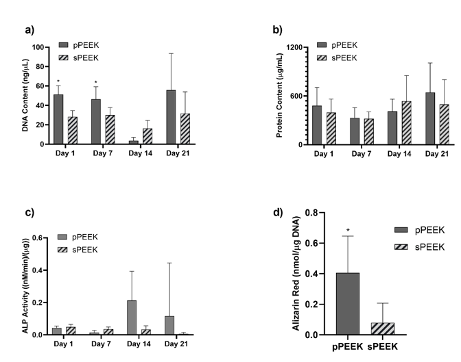 Data obtained from the DNA assays and the live/dead imaging indicated that both sample types were biocompatible in vitro. Figure 5, graph (a), quantitatively confirms the presence of DNA on both PEEK specimens. DNA content is significantly higher on the pPEEK specimens for Day 1 and Day 7. However, qualitatively there seems to be a drop in total DNA content for both specimen types on Day 14 which could indicate a shift to cellular differentiation instead of proliferation. Total protein content is relatively the same for both specimen types at each time point. However, this data does confirm the presence of protein on each specimen type with possible increases on Day 14 and Day 21. ALP activity of the pre-osteoblast cells is shown in Figure 5, graph (c), which shows an increasing trend of the pPEEK specimens from Day 14 to Day 21 indicating a shift from proliferation to differentiation. This shift also corresponds to the DNA data obtained in graph (5a) and the day 21 live/dead imaging in Figure 4. The Alizarin Red data in Figure 5, graph (d), shows that pPEEK significantly outperforms the sPEEK in having more overall mineralization. This data corresponds with the downshift in DNA for the pPEEK on Day 14 and increase in ALP activity on Day 14 for the pPEEK. This information indicates that the pre-osteoblasts more readily underwent differentiation during the 21-day period on the pPEEK specimen type and therefore had more overall osteoblast mineralization by the end of the study. A study done by Civantos et al. investigated the affects different porosity ranges had on cellular reactions [30]. The research group studied titanium specimens having pore sizes of 100-200 µm, 250-355 µm, and 355-500 µm and observed a higher ALP activity by day 7 for all porous specimen types compared to a dense non-porous specimen indicating that the pre-osteoblastic MC3T3 cells have a higher affinity for the porous surfaces [30]. These findings are similar to the data in this study pertaining to the patterned PEEK specimens which had an average diameter pore of 476.5 µm aiding in more ALP activity observed and higher overall mineralization.