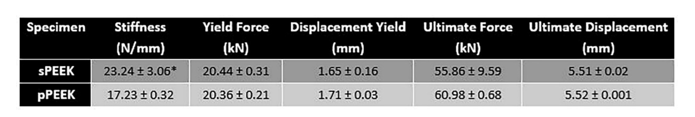 Table 2: Average values for the compression testing of smooth and patterned PEEK. The * indicates significant difference of p < 0.05.