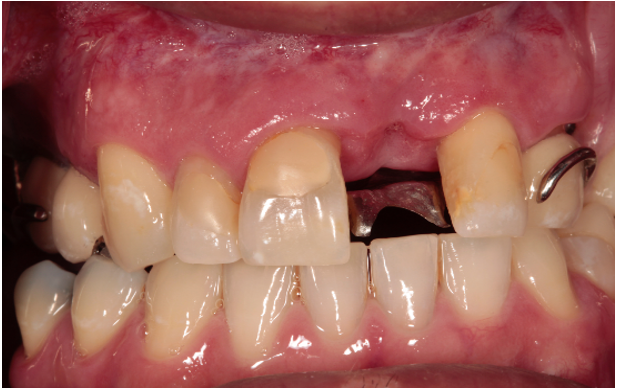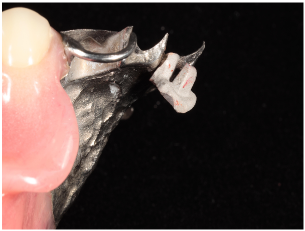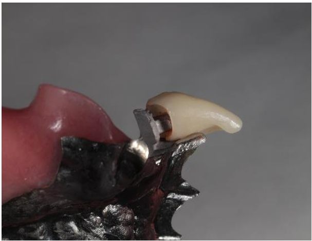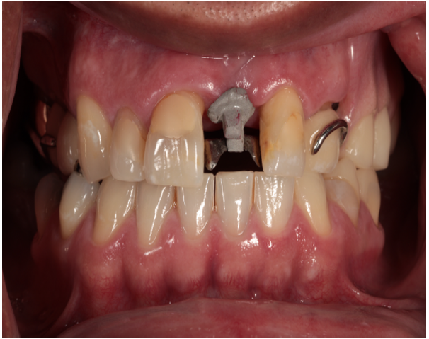 Figure 4: Crown being placed on obturator abutment to replace missing maxillary central incisor.