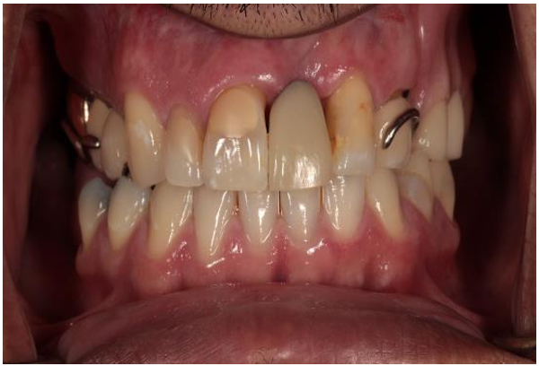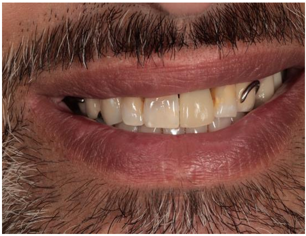 Figure 6: Frontal smile photograph of patient with maxillary obturator and new maxillary central incisor added to obturator.