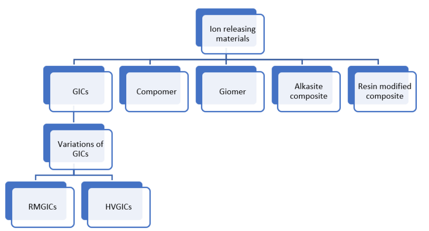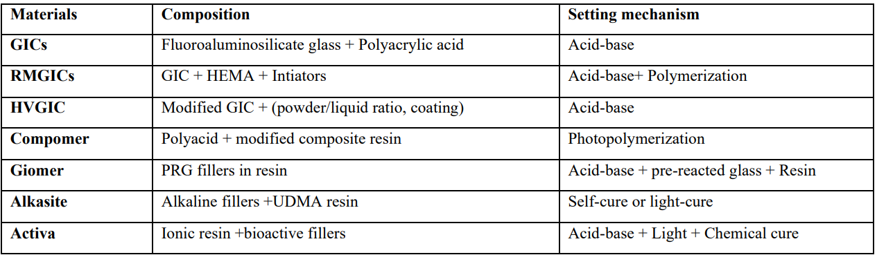 Results: GICs: Moderate antibacterial activity, high fluoride release, limited mechanical strength. RMGICs: Moderate antibacterial activity, moderate fluoride release, improved mechanical strength. HVGICs: Strong antibacterial activity, good fluoride release, high mechanical strength. Compomers: Good aesthetics, limited fluoride release, moderate mechanical strength. Giomer: superior aesthetics, minimal antibacterial activity, low fluoride release, moderate mechanical strength. Alkasite composites: Moderate antibacterial activity, moderate fluoride/ion release, high mechanical strength. Modified resin composite: Strong antibacterial effect, bioactive fluoride and ion release, high mechanical strength.