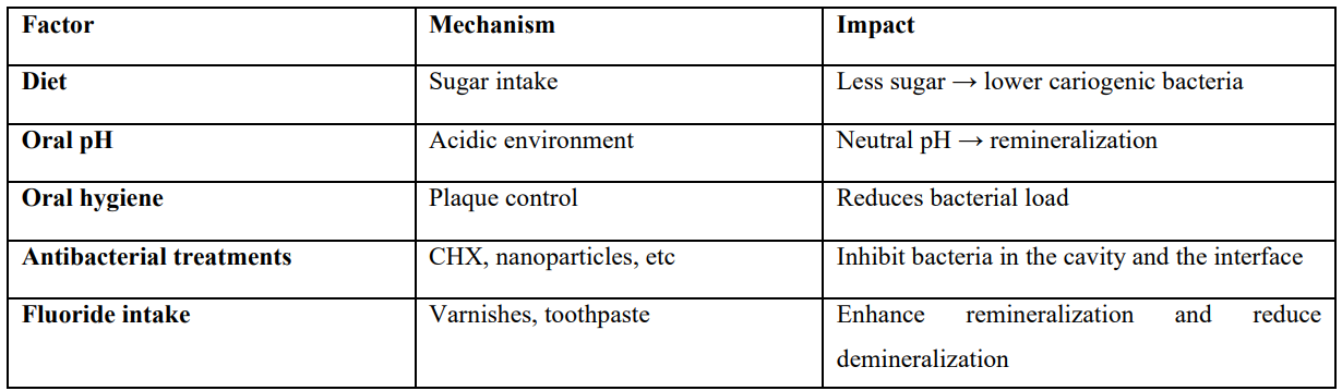 1. Oral hygiene is one of the most important factors affecting F release. Research indicates that fluoride's cariostatic effects are primarily localized rather than systemic [105,106]. When combined with proper oral hygiene, this effect could be even more pronounced [107].