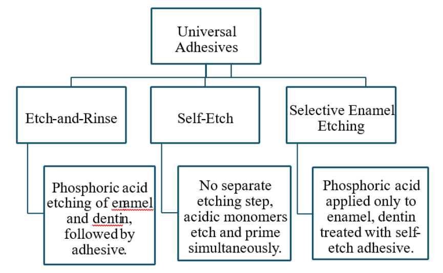 Referred to as “multi-mode” or “multi-purpose” adhesives because they can be used in different application modes: as SE adhesives, ER adhesives, or in a combined approach as it is done as SE on dentin and ER on enamel or known as “selective enamel etching” [33,74]. This flexible adhesive concept supports choosing the most straightforward version of each technique by using one-step SE or two-step ER systems [75]. The key distinction between universal adhesives and traditional onestep SE adhesives lies in the inclusion of functional phosphate and/or carboxylate monomers in universal adhesives. These functional monomers can promote chemical bonding with calcium in hydroxyapatite, enhancing adhesion to tooth structure [76]. Different applications strategies shown in Figure 1.