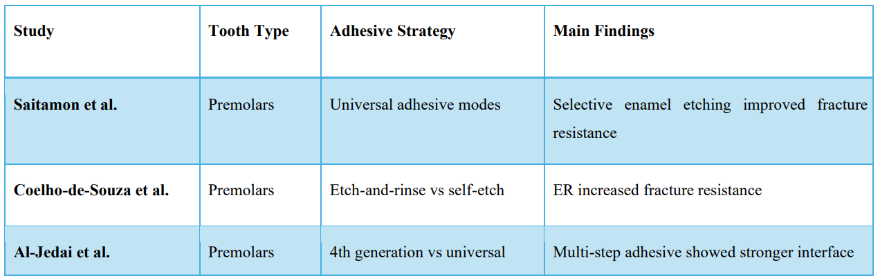 Conclusion: Available evidence suggests that universal adhesive systems can influence the fracture resistance of premolar teeth restored with MOD resin composite restorations. Variations in adhesive composition and bonding strategy may affect the mechanical performance of the restored tooth structure. However, differences in mechanical testing protocols limit direct comparison among studies. Further standardized investigations are recommended to clarify the long-term mechanical behavior of these adhesive systems.